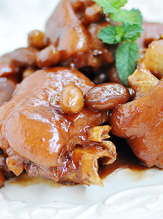 主料:猪蹄 (800克) 花生 (150克) 调料:油 (适量) 盐 (1.5茶匙) 姜 (10克) 大料 (2朵) 腐乳 (20克) 老抽 (1汤匙) 生抽 (2汤匙) 冰糖 (5块) 干辣椒 (3个) 料酒 (2汤匙)香叶 (1片)