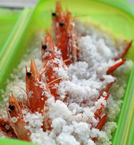 ? 6.再把其余炒热的盐均匀覆盖在虾身上面