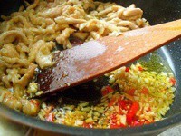 4 热锅凉油(菜籽油),炒到断生,烹入少许料酒。