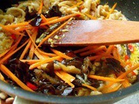 6 然后保持肉丝在旁边的状态,下胡萝卜和木耳丝炒至断生,在蔬菜里下约1g盐。然后烹入之前的滋汁,合匀,起锅前加入葱花