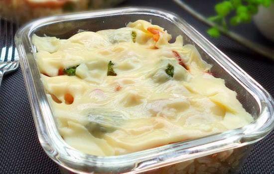 食材 :米饭2份 鲜虾150g 鲜鱿鱼须250g 草菇100g 豌豆50g 玉米粒50g 红椒1根 西兰花200g 姜15g 芝士片5片鸡蛋2枚