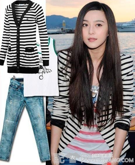 窄条纹可比宽条纹能够掩人耳目。条纹越宽视觉效果越膨胀。当然,太细太规则的条纹也会让你对面的人晕倒。范冰冰这身条纹宽细、间距都恰到好处,而且在选择条纹时聪明地抛弃了修身款式,松垮适度,随行而阳光的形象就塑造出来了。