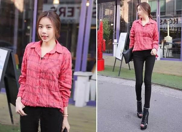 穿衣技巧:时尚靓丽的格子衬衫,色调很出彩,淡淡的格子纹,穿在身上春日展现活力,搭配黑色紧身裤和高跟短靴,身材一下子变得高挑,手里拿着折叠包包,职场的OL最适合这样穿。