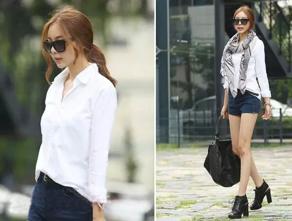 穿衣技巧:衬衫最适合职场的OL们,这款白色衬衫款式简约,轻松穿出清纯感,搭配蓝色牛仔短裤和高跟鞋,大秀美腿,腿部的线条瞬间拉长~