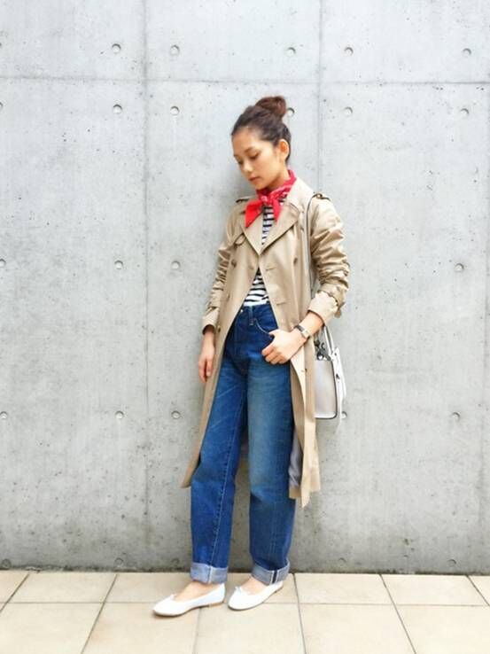 驼色风衣外套彰显好品味,搭配翻边宽松型牛仔裤非常时髦。再增添一款红色小围巾亮点十足,很有春天的气息哦!