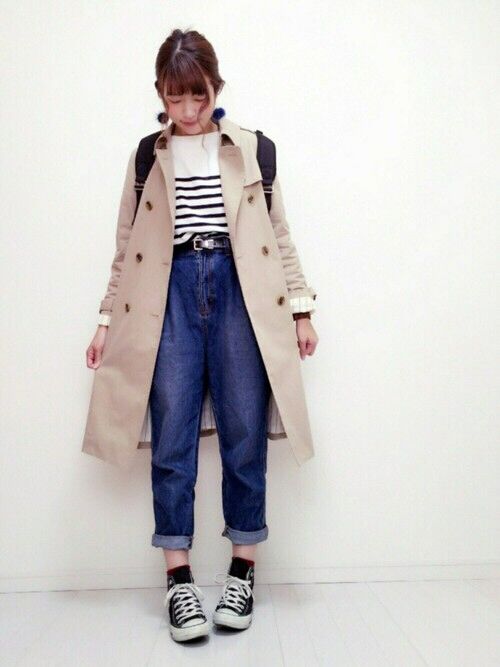 风衣与紧身裤装搭配肯定没有亮点,如果搭配宽松版型的翻边牛仔裤就更显时髦咯!高腰的设计与长款外套也能扬长避短。