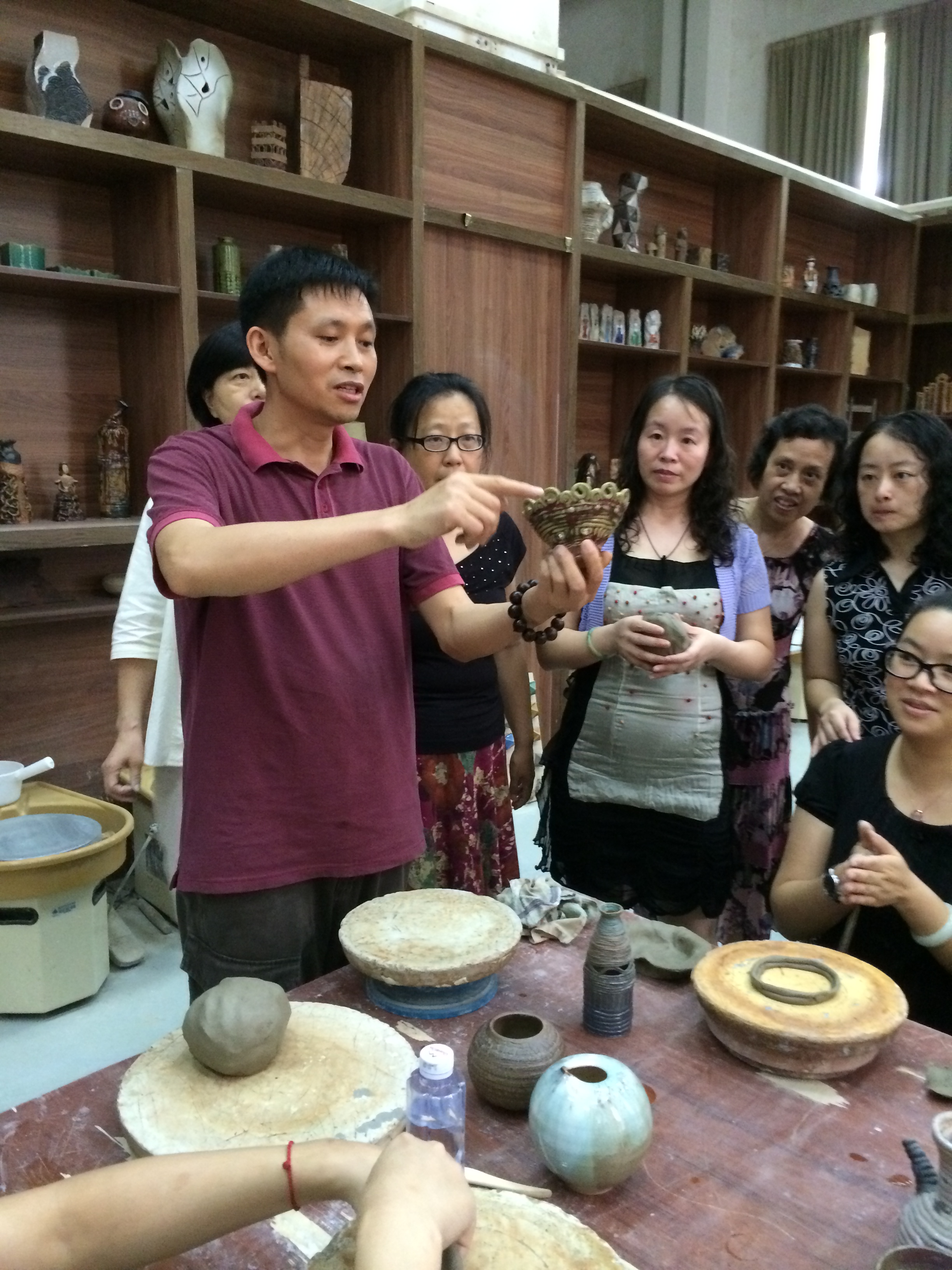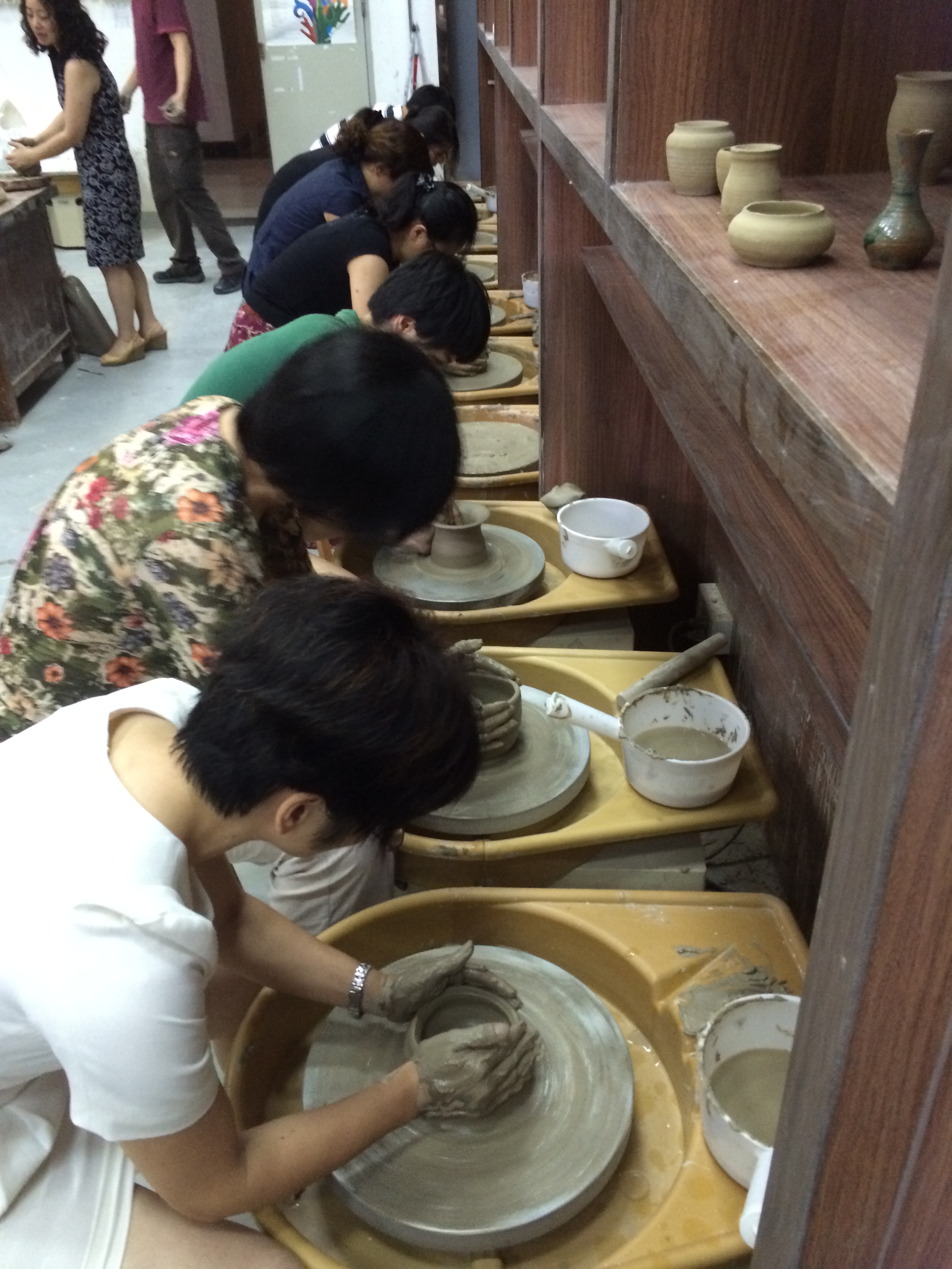 老师们饶有兴致地体验了捏陶和拉胚两种不同的制作方式,并在刘老师的逐个指导下,创作出独一无二的陶艺作品。(妇委会时尚职人坊)