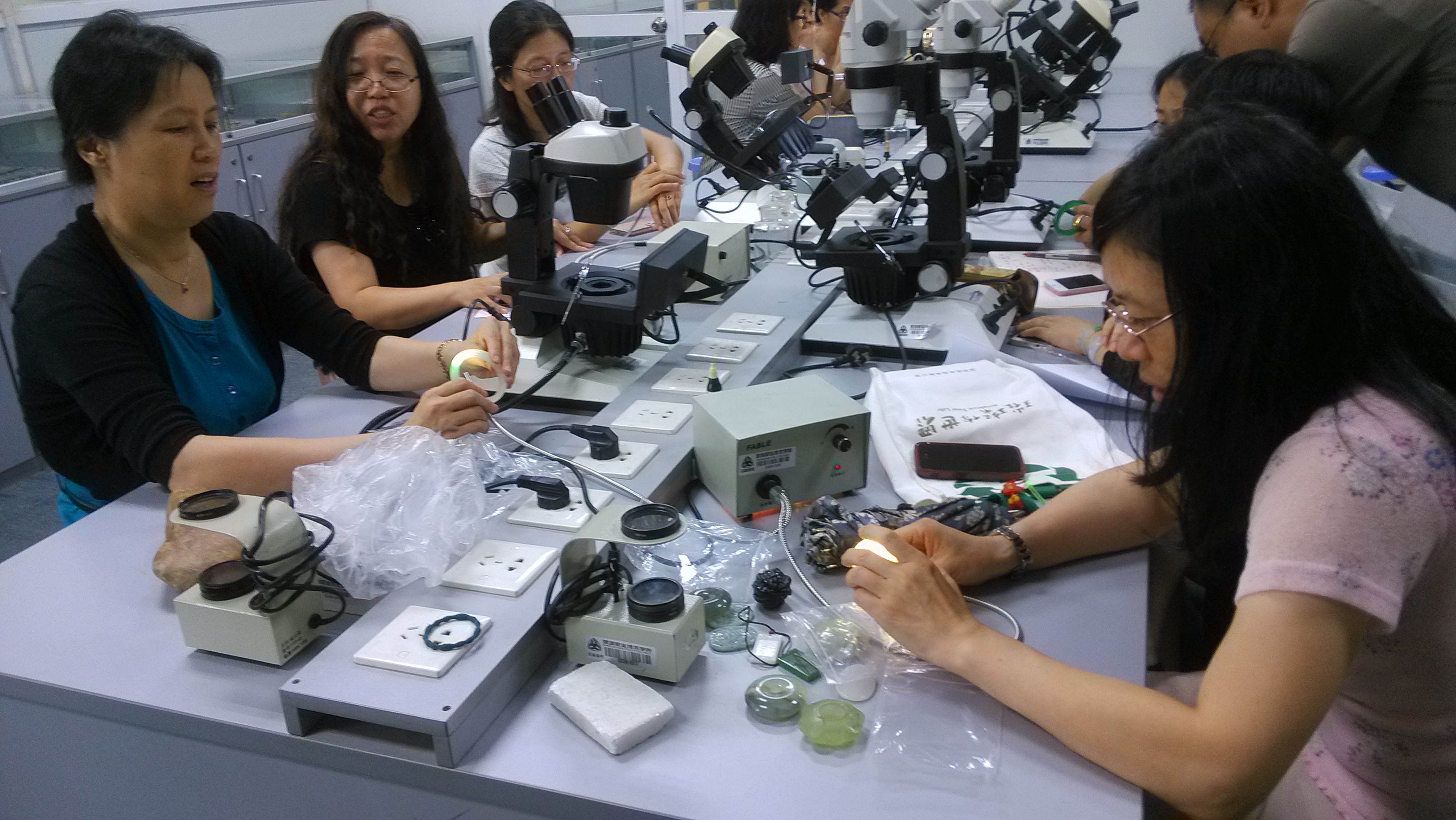 讲座中,佟景贵老师首先讲解了翡翠在价格、产地、种类、等级方面的问题,对翡翠的选择、认识、种类、光泽等都提出了独家见解;随后,佟老师又介绍了翡翠的特质与收藏价值,给大家播放了一系列精致漂亮的翡翠相片;期间为教师们展示了各种各样的翡翠样品及仿翡翠样品,并教大家该如何判断翡翠级别及真伪;最后,佟老师提出专业的鉴别方法与购买注意事项。台下的老师们认真听取佟老师的精彩分析,随后根据自己所佩戴的翡翠、玛瑙等饰品提出各种问题,并且与佟老师一起使用专业的仪器学习翡翠鉴定。(校妇委会时尚?职人坊)